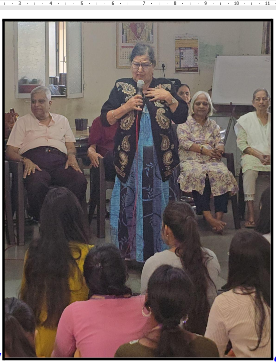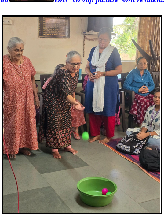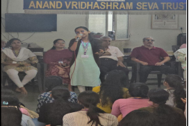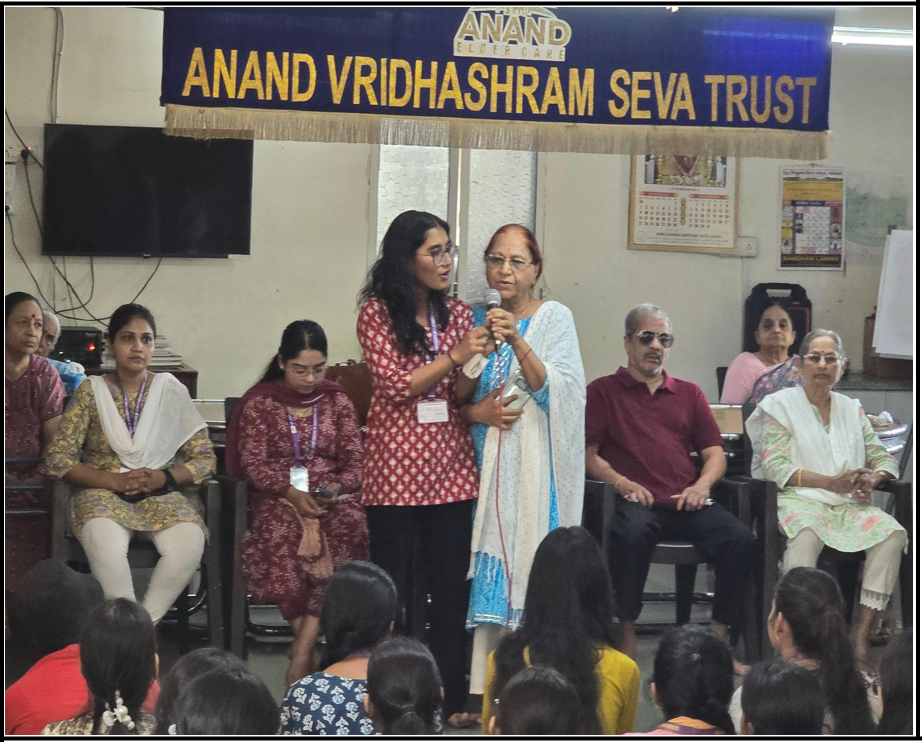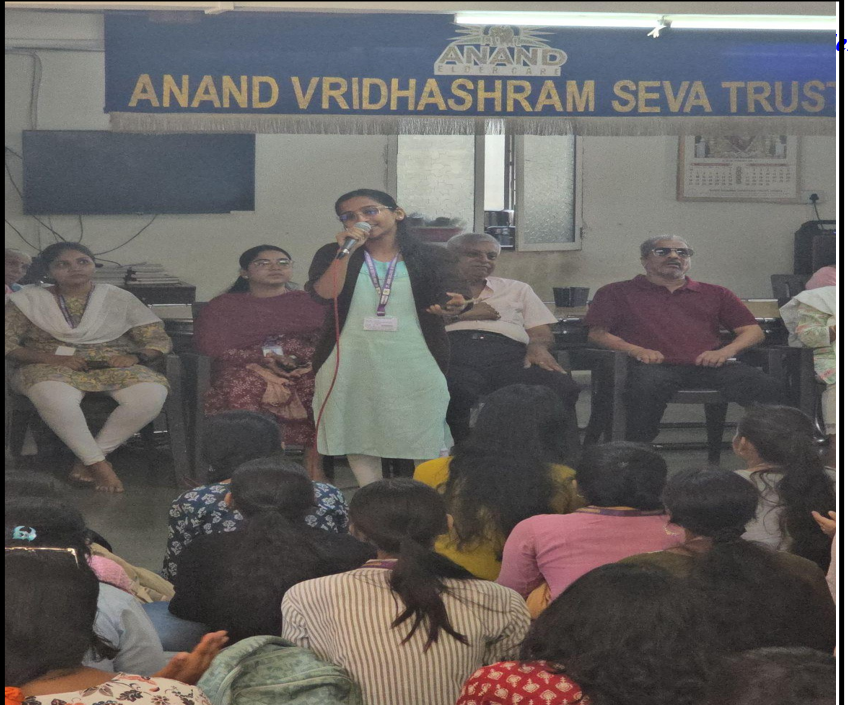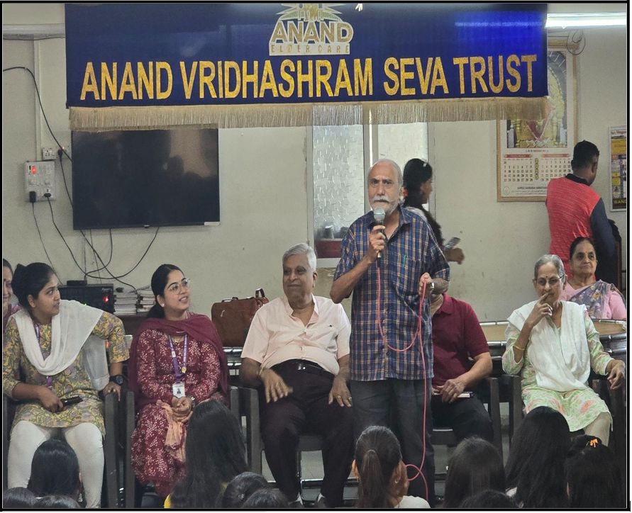 The group of students, accompanied by faculty members, visited the Anand Vridhasharam with the aim of engaging the residents meaningfully and creating a joyful experience for them. Upon arrival, students were warmly welcomed by the staff and residents. The visit began with an interactive session, during which students engaged in conversations with the elderly, listening to their life stories, experiences, and perspectives. This interaction helped students better understand the challenges faced by senior citizens and the importance of emotional companionship. Students also organized a series of fun games specially designed to be inclusive and enjoyable for the residents. These games created a lively atmosphere and encouraged active participation, bringing smiles and enthusiasm among the elderly. The students then presented cultural performances, including dance and singing segments. The residents also joined in by singing along and sharing light-hearted moments, making the session interactive and memorable.