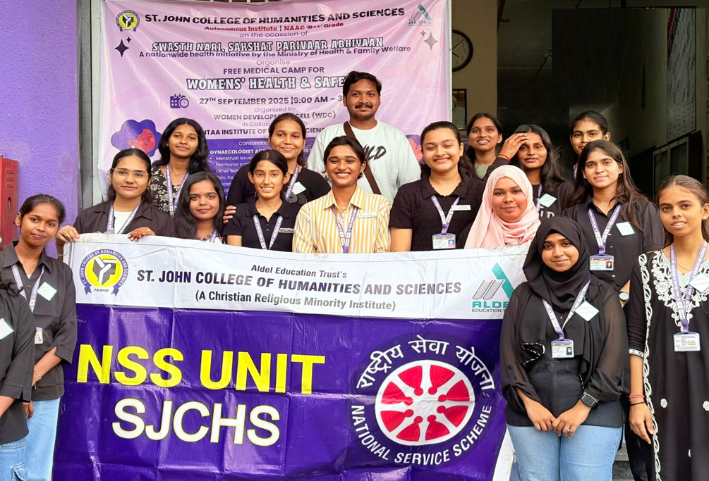 NSS Organise a Free Medical Camp for Women’s Health & Safety on 27/09/2025, 9:00 a.m. – 3:00 p.m. at the premises of St. John College of Humanities and Sciences. Medical Team from Vedantaa Institute of Medical Sciences, Dahanu were the Resource Person, NSS Programme Officer & Faculty Coordinators were the Activity In-charge and 15 NSS Volunteers participated in the programme