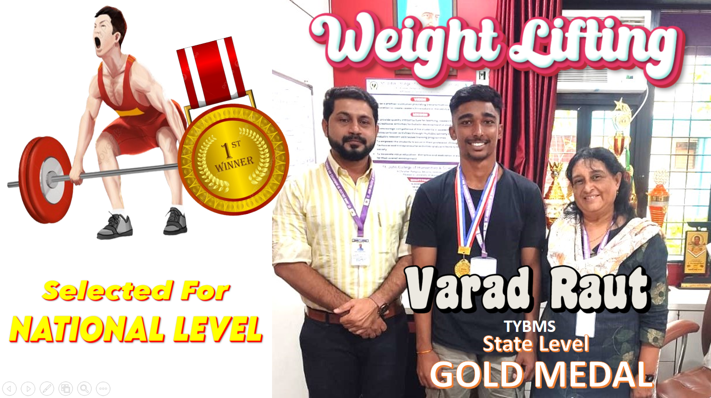 Congratulations to Mr. Varad Raut, a TYBMS student, for winning the Gold Medal in the Maharashtra State Powerlifting Bench Press Competition. With this outstanding achievement, he has also been selected to represent at the National-Level Bench Press Championship.